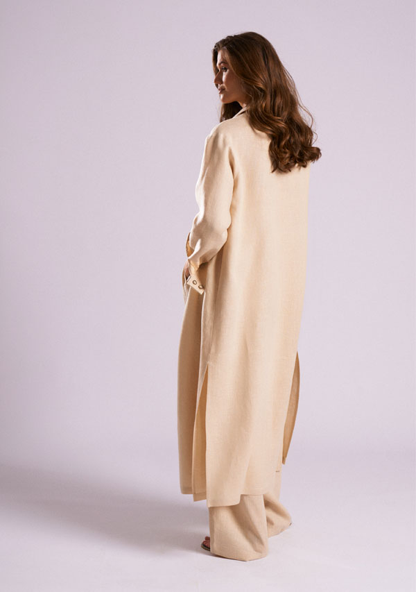 Стильное платье-рубашка прямого силуэта выполнено из льняного полотна. Линия плеча спущена, рукава рубашечного кроя — по низу прихвачены на манжеты. Горловина оформлена отложным воротником. Борта обработаны притачными планками и пуговицами. В боковых швах предусмотрены вертикальные разрезы и функциональные карманы. При желании линию талии можно подчеркнуть сьемным поясом с пряжкой. Рубашка прекрасный элемент базового гардероба.