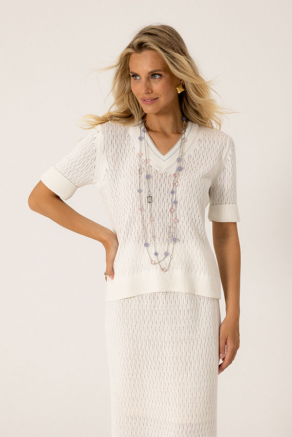 Комфортная трикотажная юбка прямого силуэта. Выполнена из смесовой хлопковой пряжи. Модель вывязана ажурным переплетением. Верхний срез обработан трикотажным поясом с эластичной тесьмой. В боковом шве — небольшой разрез. Изделие на подкладке. Юбка отлично сочетается с джемперами и кардиганами различного кроя.