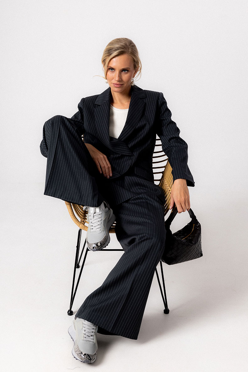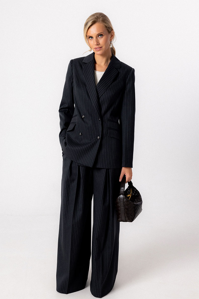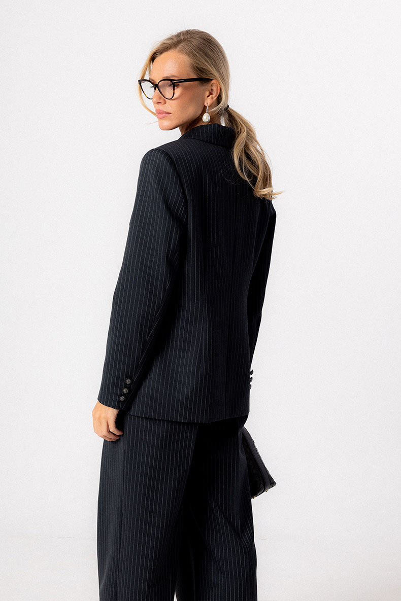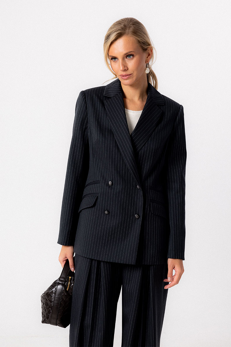 Классический двубортный жакет полуприлегающего силуэта выполнен из смесового полушерстяного полотна с тонкой вертикальной полоской. Линия плеча четкой формы, рукава втачные с рядом пуговиц. Борта оформлены английским воротником с лацканами. Застежка на петли и пуговицы. Модель снабжена функциональными и декоративными карманами в рамку. Жакет отлично сочетается с юбками и брюками различного кроя.